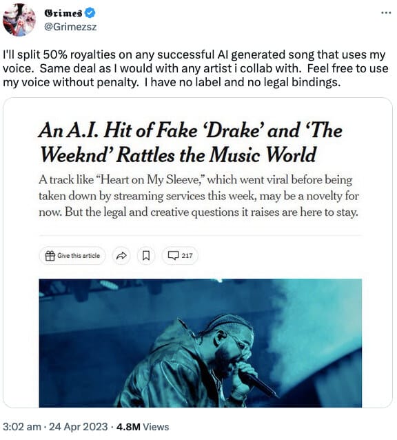 Diskussionen blussede atter op, efter Grimes tidligere på ugen slog fast, at hun er åben overfor idéen om at »open-source alt kunst og dræbe copyright«.